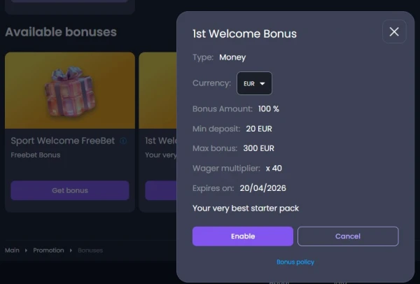 We bieden ook een aparte sport-deal voor de eerste keer: een 50% boost op je eerste sportstorting tot €50. Je kunt de casinowelkomststappen kiezen, de sportaanbieding, of allebei wanneer dat beschikbaar is in je account.